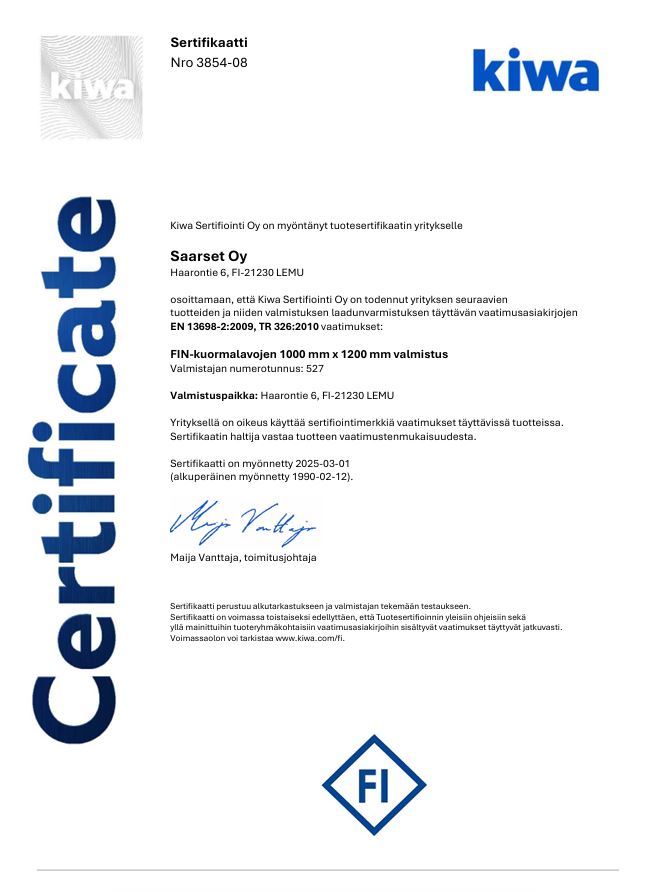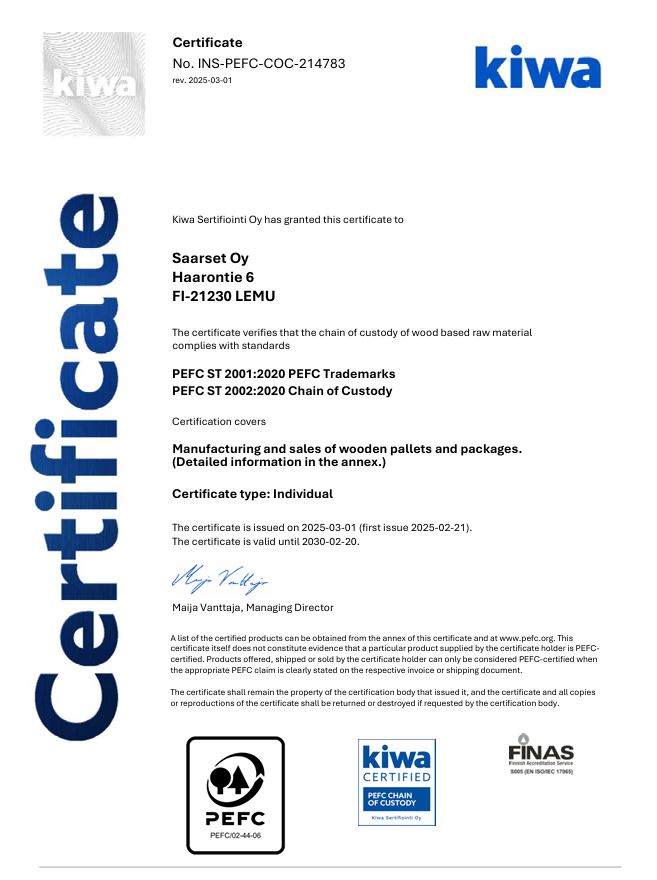 Teemme yhteistyötä meitä mahdollisimman lähellä olevien sahojen kanssa, jolloin säästämme kuljetuskustannuksissa ja päästöjäkin syntyy vähemmän. Käyttämillämme sahoilla on vastuullisesta metsänhoidosta kertovat FSC- ja PEFC-sertifikaatit.